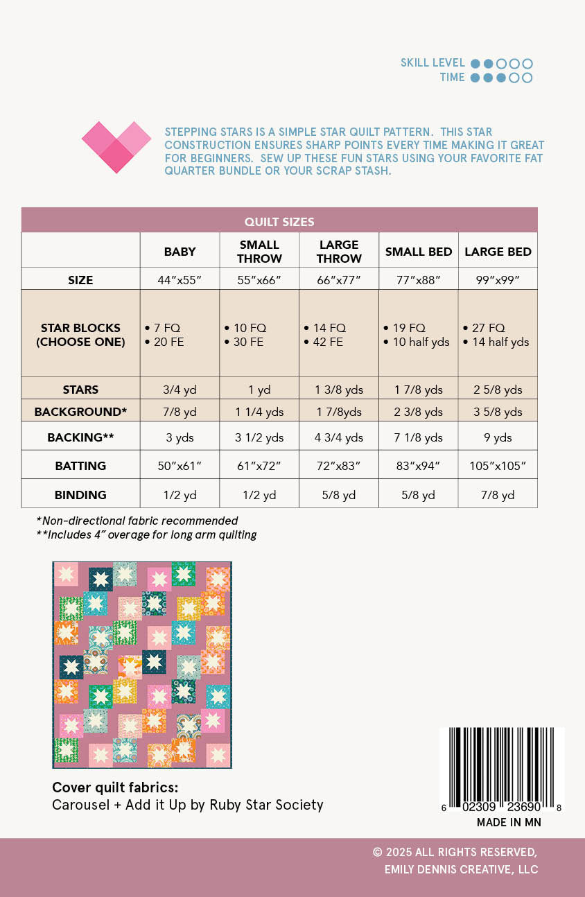 Perfect for stash busting, Stepping Stars is both fat quarter and fat eighth friendly, making it a versatile choice for using fabrics you already have and love. The pattern includes instructions for five sizes from baby quilt to large bed so you can create the perfect quilt for any occasion.